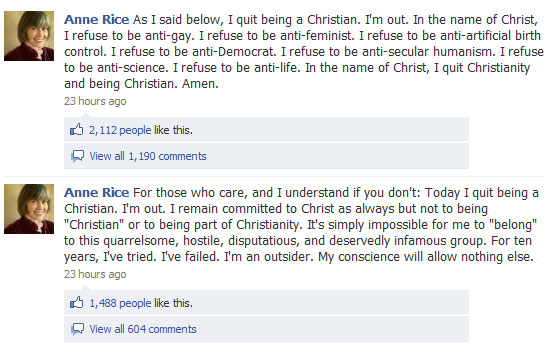 Ik vind het jammer dat Anne Rice meent het christendom vaarwel te moeten zeggen omdat Gods grondpersoneel er regelmatig een potje van maakt. Ik hoop dat ze Christus kan blijven volgen en dat ze, misschien op termijn, een groep mensen kan vinden om samen haar geloof te vieren.